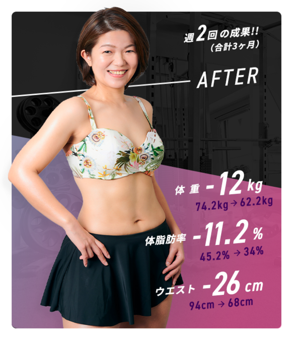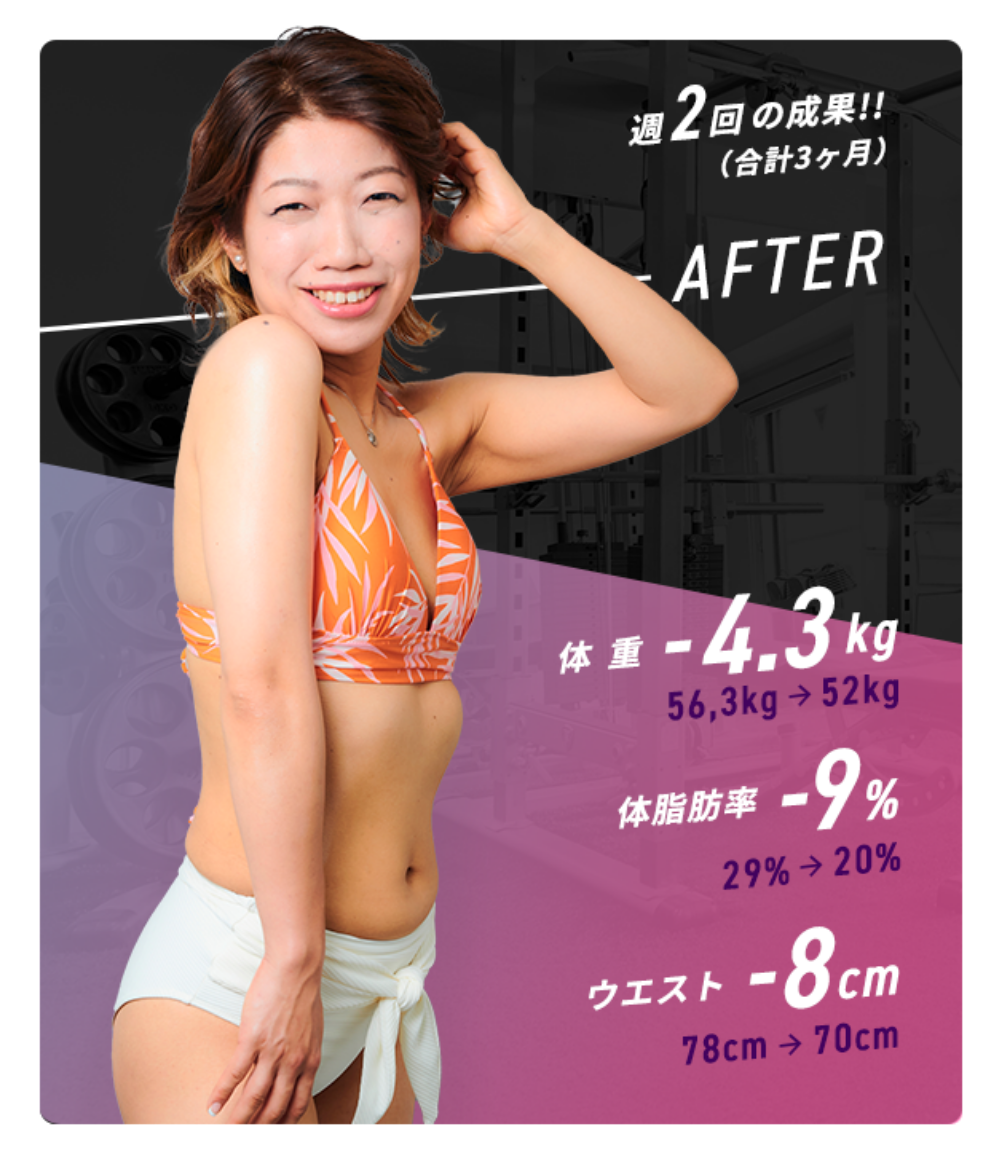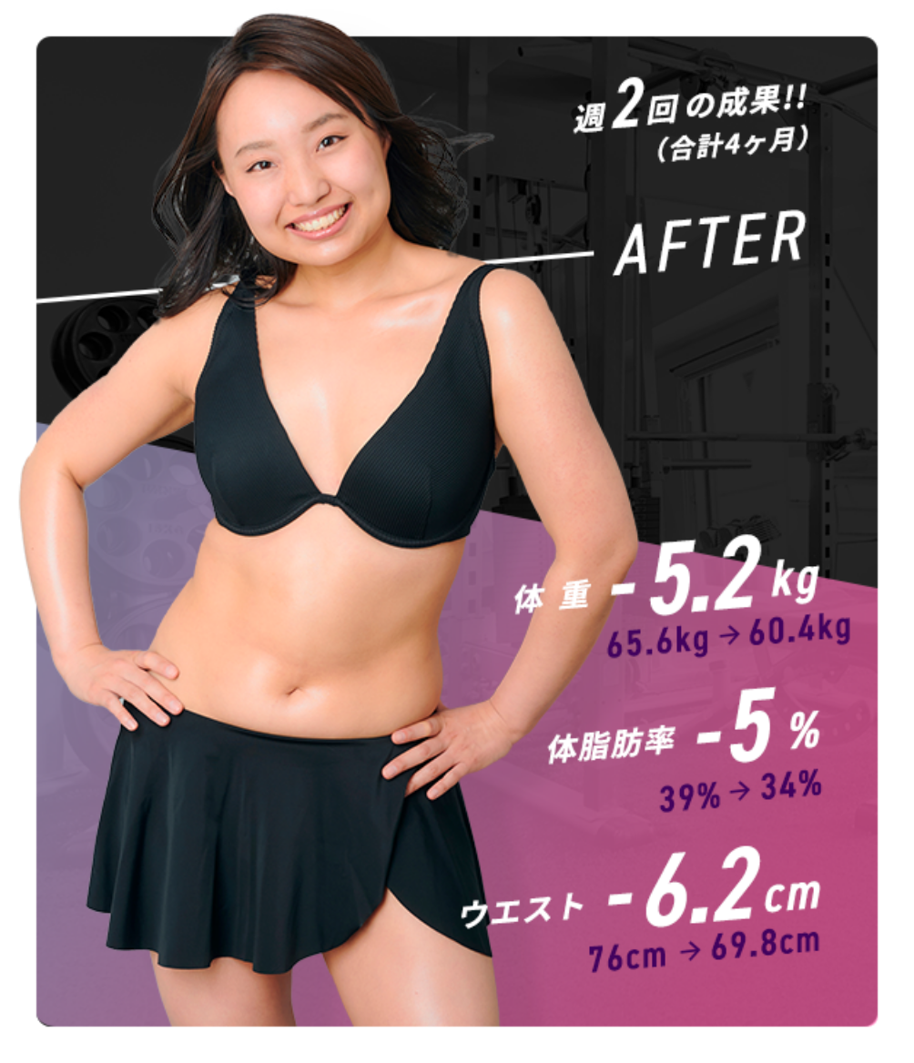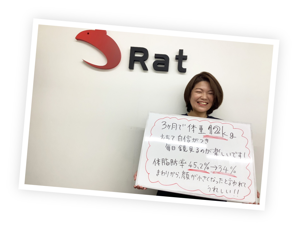 Ratに通う前は糖質制限で5kg痩せたがすぐにリバウンドしてしまっていました。似合う服の幅も少なく自信も無くなっていた中、好きな人から「痩せたら?」と言われた一言でRatに通うことを決意。過度な食事制限もなくトレーニングも楽しく続けられた結果、3ヶ月で−12kg達成!!体重も過去最高に落ち、着たい服も着れるようになったので自信がつきました。周りから「顔が小さくなったね」と言われたことが1番嬉しかったです!