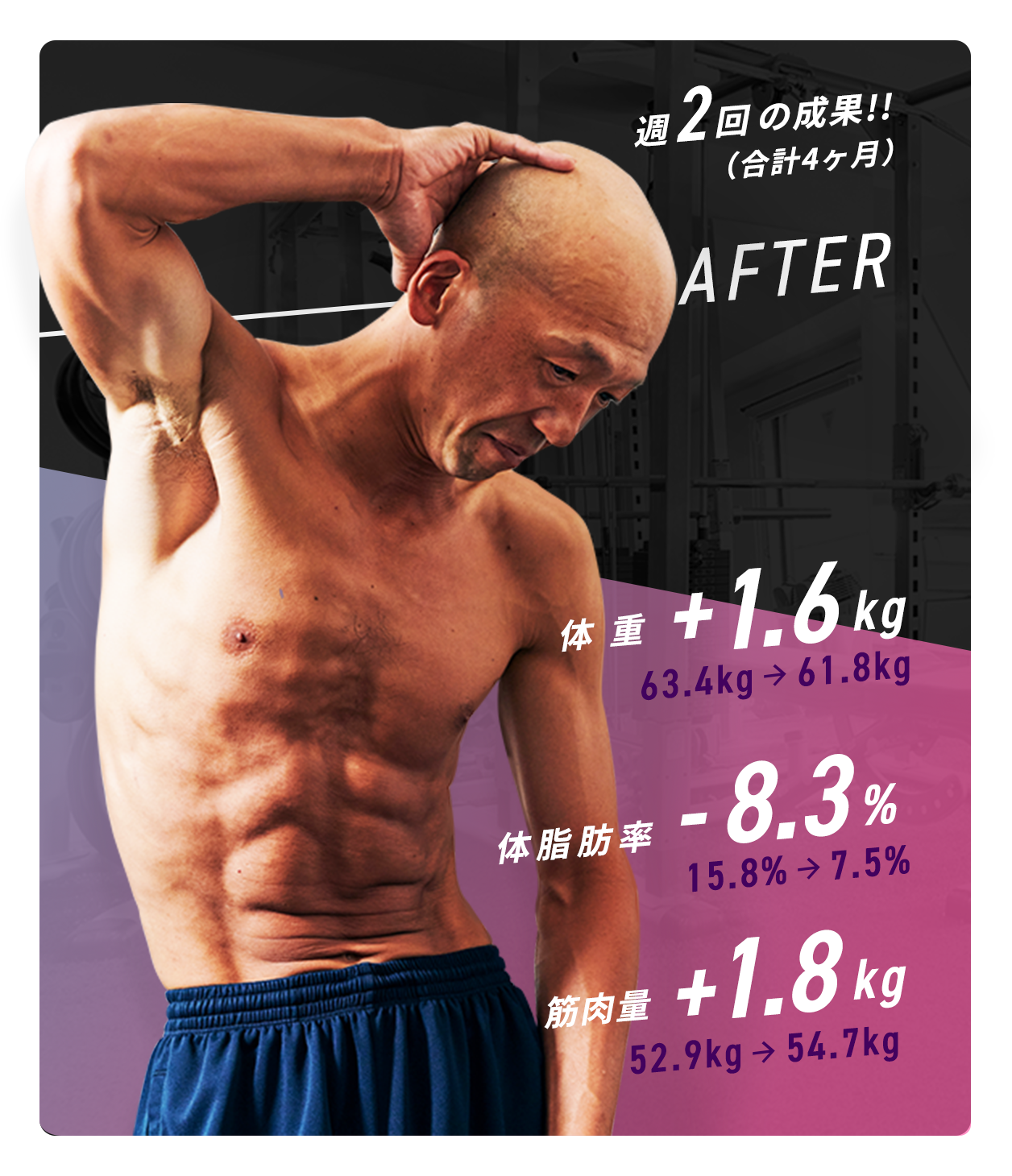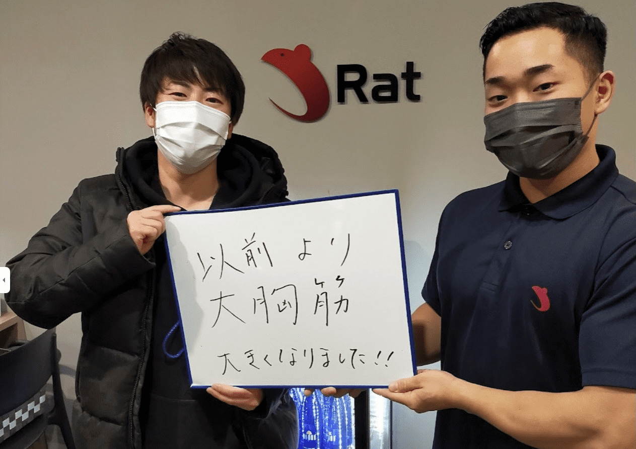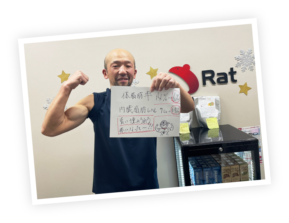 身体が細くヒョロヒョロで自信がない、営業成績もイマイチな自分を変えたいと思いRatに通い始めました。3ヶ月通ったことで体重5kgアップ!筋肉量も3,7kgアップすることができ自信ごつきました!女性からもカッコ良くなったねと言ってもらえるようになりすごく嬉しかったです。